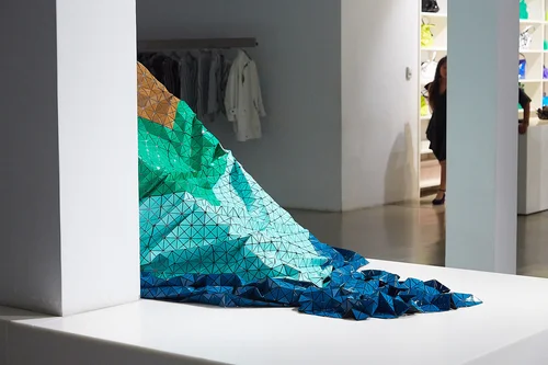 " Invité par ISSEY MIYAKE à concevoir une installation pour les D’Days 2014 , Mathieu Bassée s’empare de l’emblématique sac BAO BAO ISSEY MIYAKE et en fait la matière première d’un paysage fantastique.